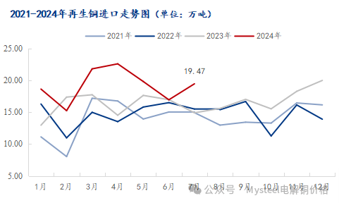 相比之下,进口再生铜市场则因国内供应紧张而显得较为活跃。在面对国内供应紧张的情况下,国内不少再生铜加工企业纷纷前往浙江、广东等地采购合适的进口再生铜。同时,市场预期8月再生铜产业政策调整,导致部分企业更青睐采购进口再生铜以规避税收风险,积极采购进口再生铜,短时间进口再生铜货源成为市场香饽饽。且据了解,7月部分远期在飘的货源都被提前预定,这也给进口再生铜贸易商一定的销售溢价空间。7月随着铜价下行,再生铜进口亏损呈现收窄的趋势,7月下旬出现了短暂的窗口盈利的局面,利好进口再生铜清关,综合上述情况,7月再生铜进口量大幅增加,一定程度上缓解了国内供应压力。