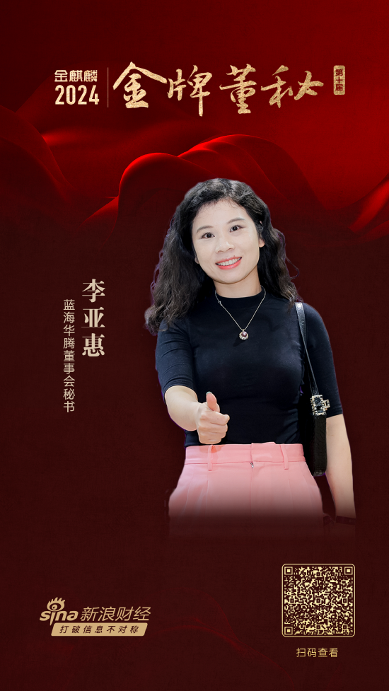 8月28日,第十届新浪财经金麒麟·金牌董秘榜单揭晓。在本次评选中,蓝海华腾董秘李亚惠荣耀加冕,荣获第十届金麒麟·金牌董秘荣誉。